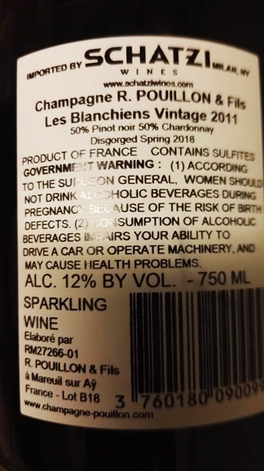 Nella controetichetta trovate anche le indicazioni del distributore americano, Pike-Schatzi Wines. Se vi dovessero capitare alcune bottiglie fatelo presente alla maison tramite la loro pagina facebook (https://www.facebook.com/champagnepouillon/), oppure tramite il loro sito https://champagne-pouillon.com/it/.