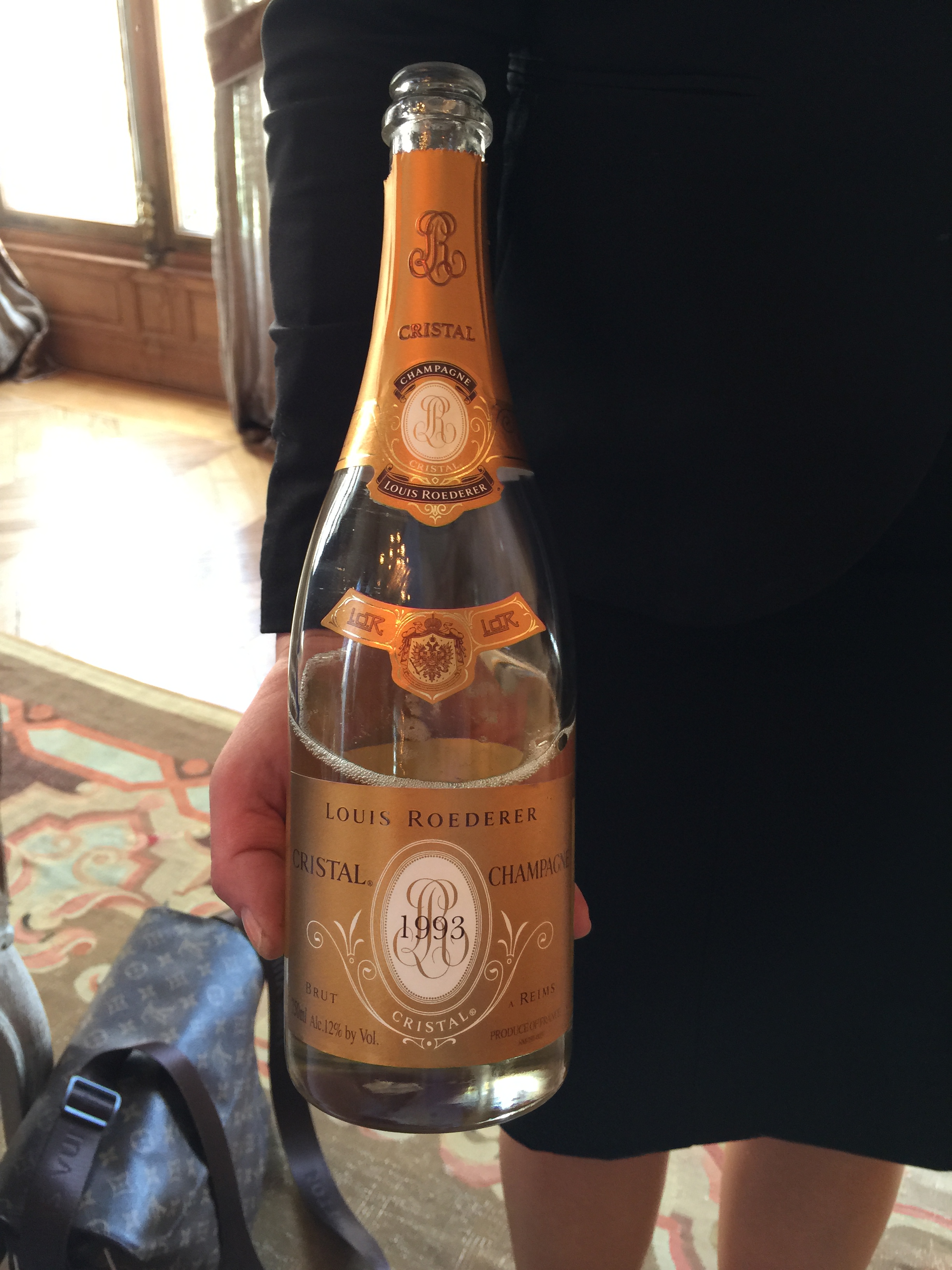 Il pranzo non è ancora finito che Monsieur Lécaillon ci abbandona per qualche minuto: il fuoriprogramma è più che apprezzato, ci servono il Cristal Rosé 2002. Epico, un rosé d’eccezione.